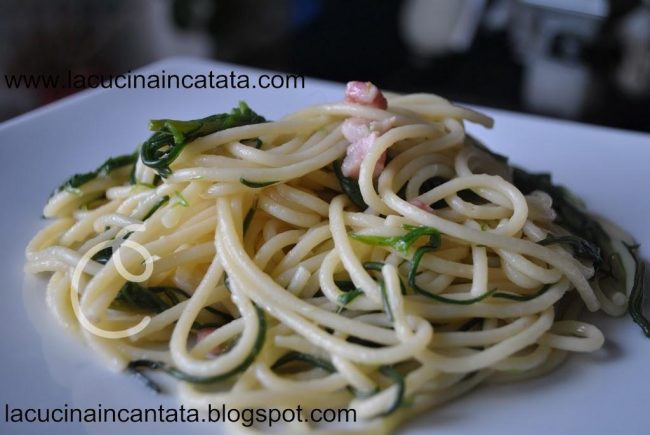 Spaghetti con pancetta agretti o barbe di frate Preparazione – Cottura – Porzione 4 persone Difficoltà – Informazioni Avevo sempre mangiato gli agretti lessati e apprezzavo di loro il sapore che vagamente ricorda gli spinaci,poi un giorno,parlando con Silvia,la mia socia di fornelli,mi ha sollecitato a fare questa ricettina,veloce,appetitosa e…diversa!!! Ingredienti 400 gr spaghetti 2…